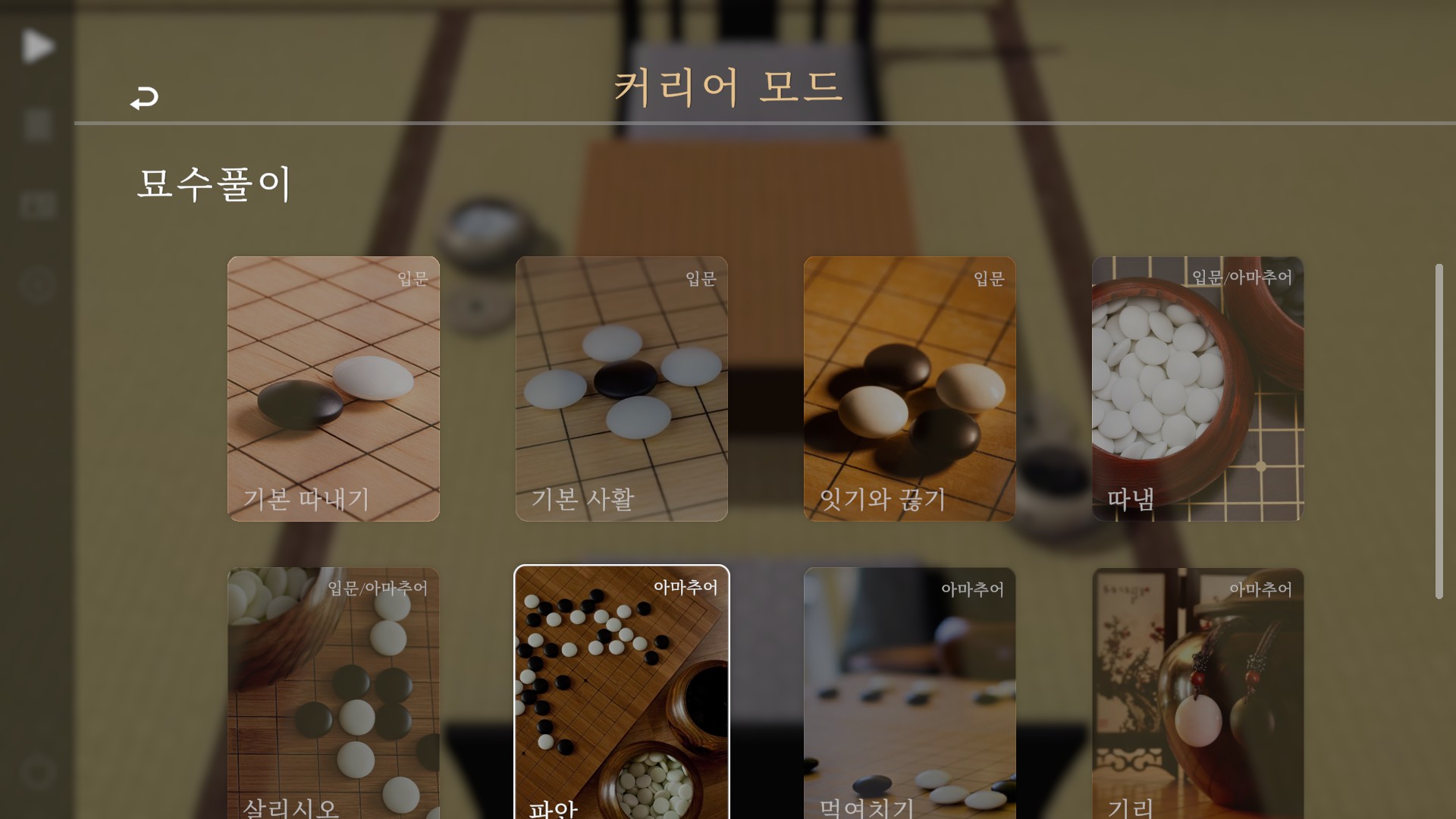 결론을 얘기하자면 바둑 초보자가 이 게임으로 바둑을 학습하기에는 별로인 것 같다. 대국 외에 '커리어 모드'라는 모드가 있어서 '트레이닝'을 할 수 있지만, 그 안에 있는 내용(따내기, 사활 등)에 상세한 설명이 없고 단순한 문제 형식이어서 그것만으로 학습하기에는 한계가 있어 보인다.