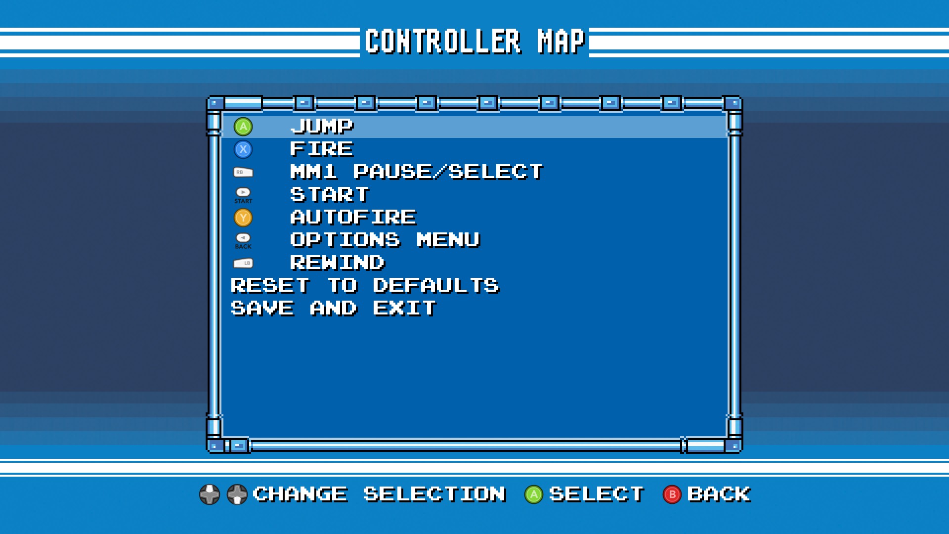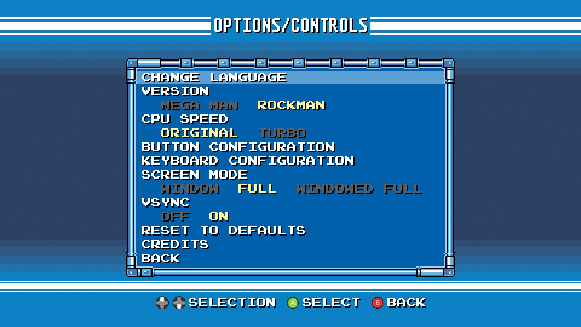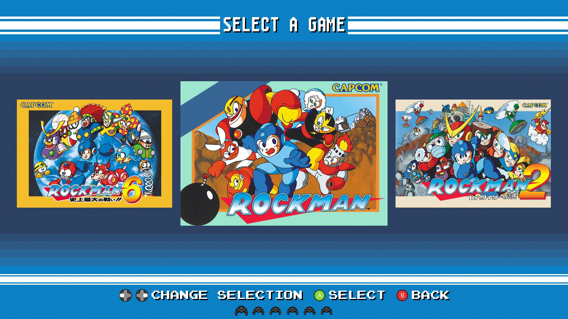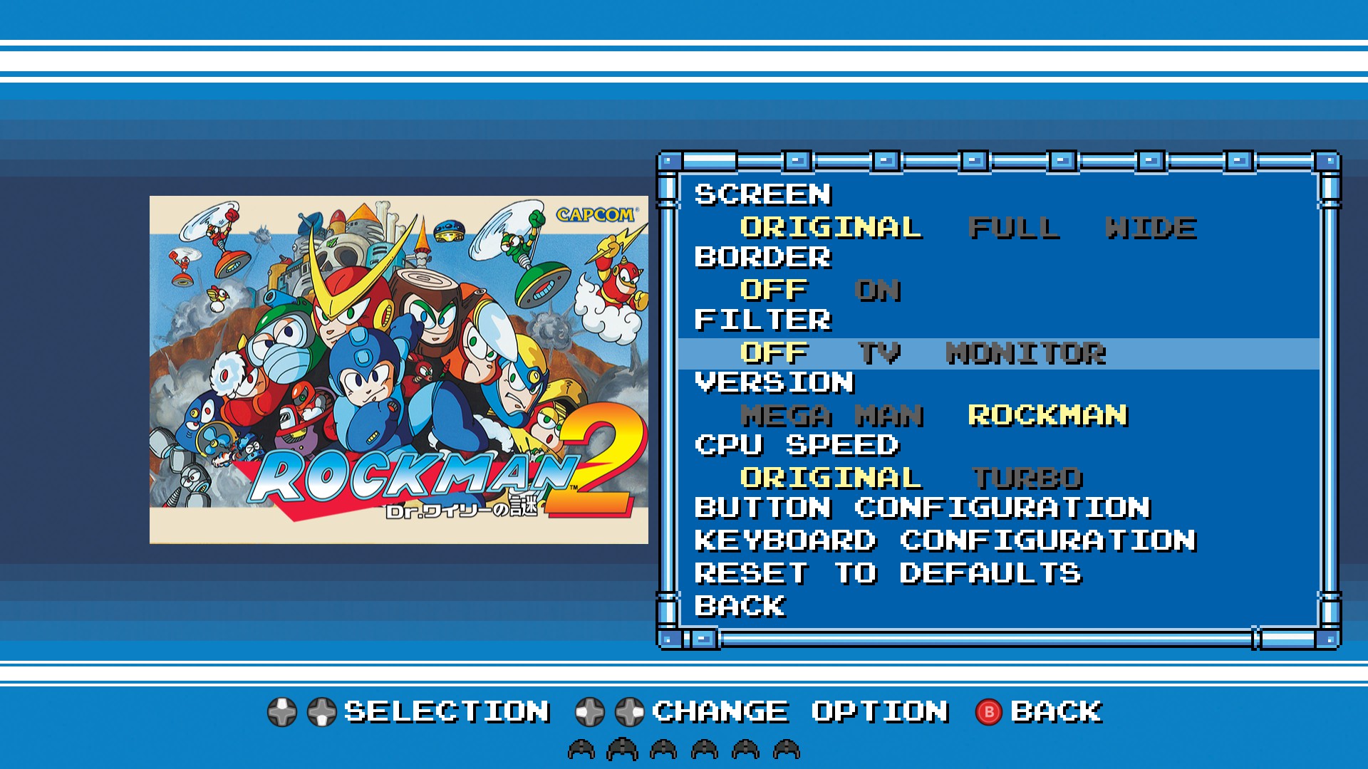 수록 게임은 북미판 버전인 'Mega Man'과 일본판 버전인 'Rockman' 중 선택할 수 있고, 화면 모드(전체화면/창모드)나 VSync 여부도 선택할 수 있었다. 게임 타이틀 별로 스크린 모드(오리지널(아마도 픽셀퍼펙트), full, wide) 등을 설정할 수 있으며, 게임 실행 중에 메뉴를 호출하면 상태 세이브/로드나 화면 필터(오리지널, TV, 모니터) 등을 설정할 수도 있다.