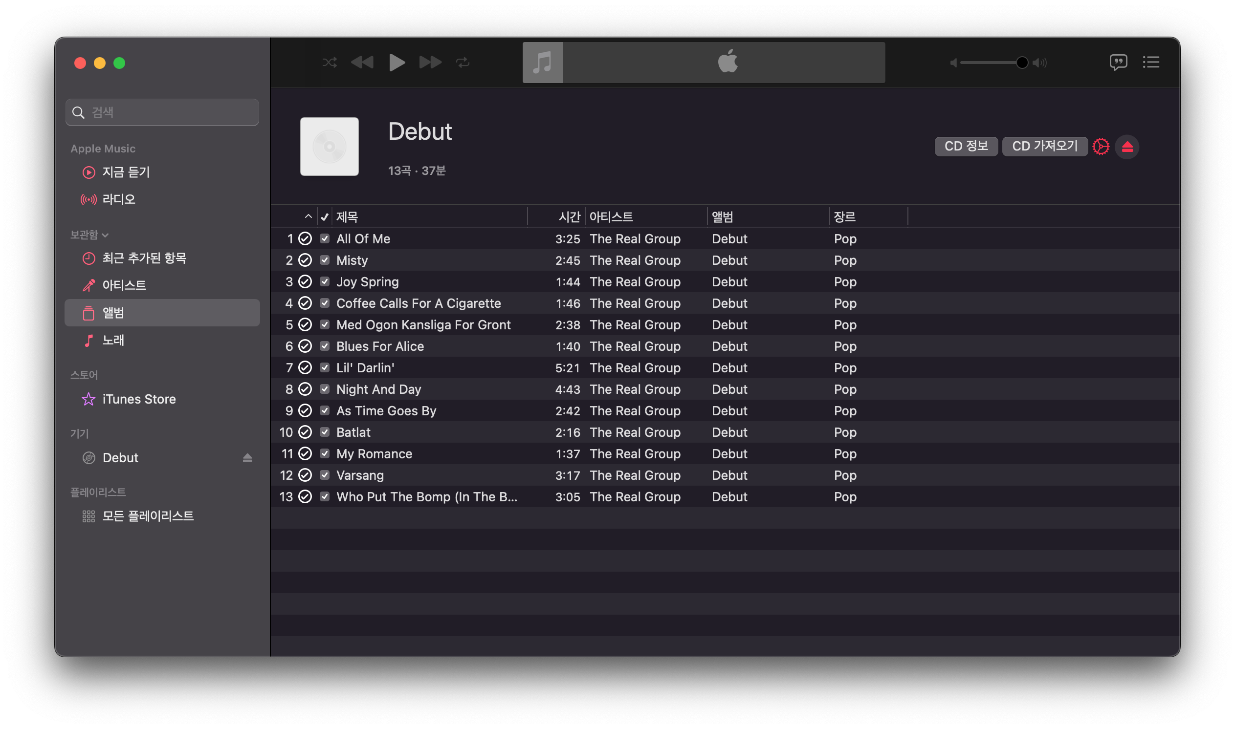 The Real Group의 데뷰 앨범인 'Debut' 앨범을 중고 CD로 구매했다. 새 CD 제품으로는 현재 시점에 구하기 쉽지 않아서 중고품을 구매했다. 상태가 좋지는 않지만 리핑해서 들을 생각이었다.