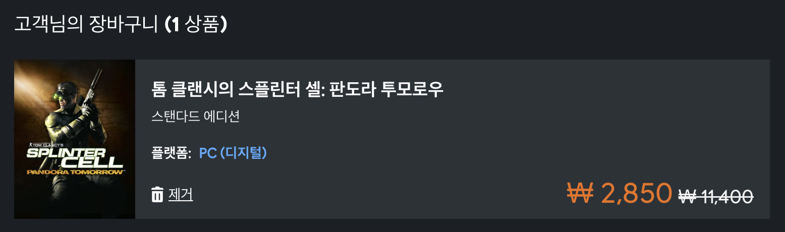 예전에 Ubisoft Connect에서 무료로 배포한 적이 있어서 '스플린터 셀' 시리즈 게임 몇 개(Splinter Cell, Splinter Cell: Chaos Theory, Splinter Cell: Conviction)는 보유하고 있다. 그런데 '스필린터 셀 판도라 투모로우' 게임은 과거 PC 패키지는 가지고 있어도 현재 플레이를 거의 할 수 없기 때문에 이 게임을 구매했다. Steam에서 구매할 수도 있는 것 같은데, 이 글의 작성 시점에 Steam에서는 할인판매를 하고 있지도 않고 어차피 Ubisoft 계정 연동 등이 필요하기 때문에 그냥 Ubisoft Connect 쪽에서 구매했다.