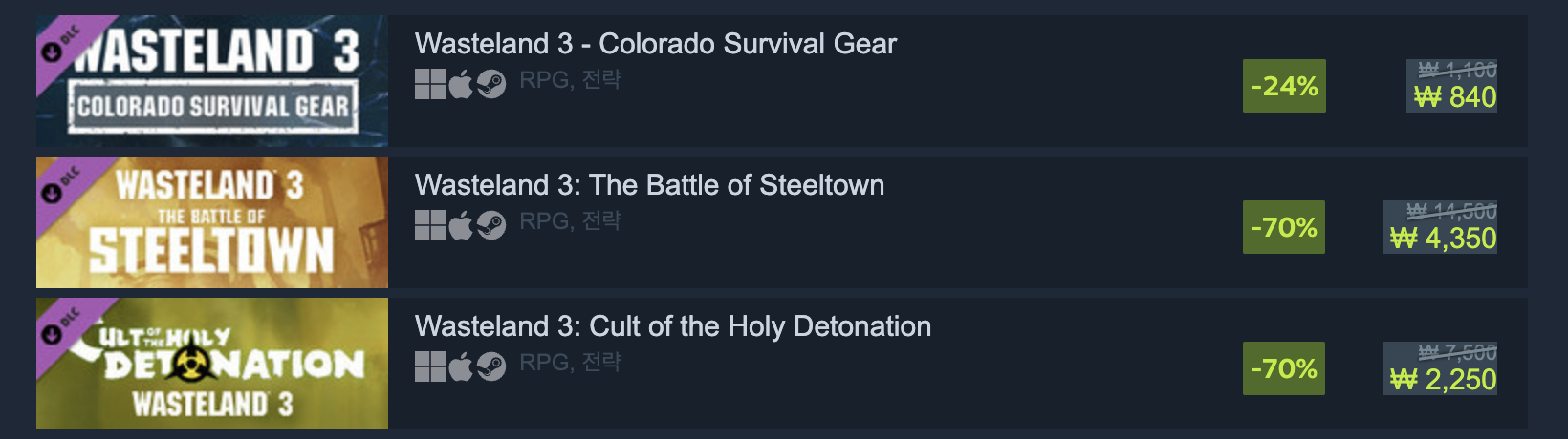 Wasteland Series Bundle을 구매함으로써 Wasteland 3의 DLC 3종을 구매했다(Wasteland 1, 2, 3은 이미 구매했으므로 결국 DLC 가격만 지불한 모양이 되었다). 3종의 DLC는 각각 'The Battle of Steeltown', 'Cult of the Holy Detonation', 'Colorado Survival Gear'이다. Wastleand 3 게임을 구매했던 것이 2021년 블랙프라이데이 시즌이었기 때문에 이들 DLC는 본편 구매 후 4년만에 구매한 것이다. 본편도 다 플레이하지 못한 게임의 확장 DLC를 구매하는 것이 낭비인 것 같기도 한데, 가격이 저렴한 편이어서 일단 구매했다.